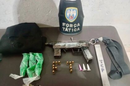 Uma ação da Polícia Militar na noite desta quarta-feira (14), no bairro Santa Helena, em São Gabriel da Palha, terminou com a apreensão de uma submetralhadora, drogas e a detenção de dois suspeitos, d...