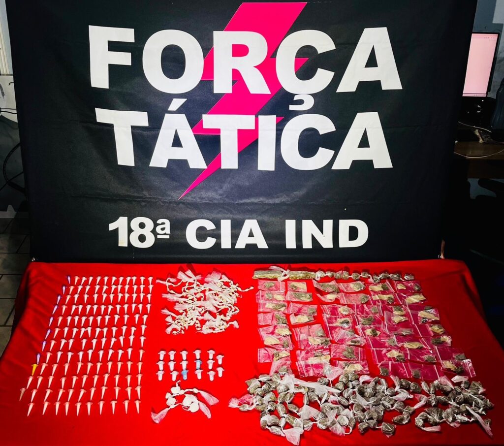 Após a fuga, os militares fizeram buscas nas proximidades e localizaram uma sacola com diversos tipos de drogas prontas para comercialização. No total, foram apreendidas 176 buchas de maconha, 186 pedras de crack e 166 pinos e papelotes de cocaína.