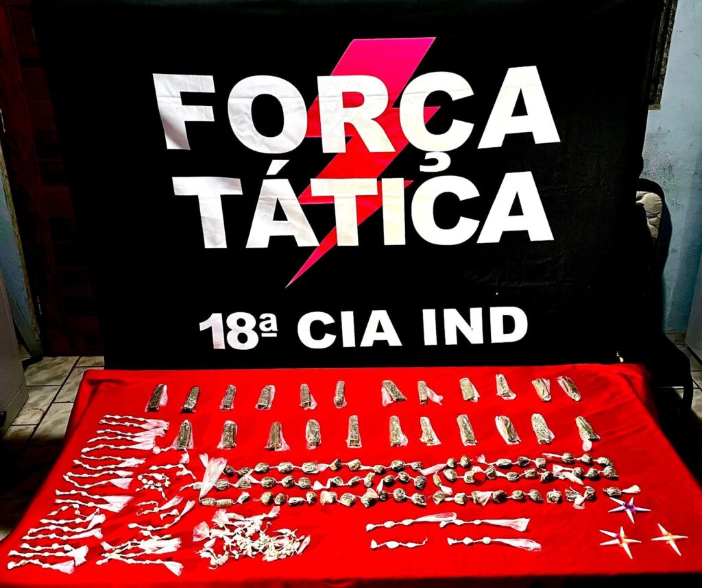 Durante a fuga, o suspeito abandonou uma sacola e conseguiu escapar, não sendo possível sua identificação. No interior da embalagem, os militares encontraram diversas porções de substâncias semelhantes a entorpecentes, entre elas pedras aparentando ser crack, buchas de maconha e porções de cocaína, distribuídas em diferentes tipos de acondicionamento.