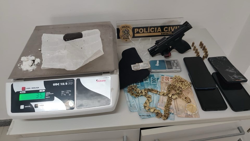 Na busca pessoal, foi localizada uma arma de fogo municiada, além de entorpecentes, dinheiro em espécie e outros objetos de interesse para a investigação. A arma apreendida trata-se de uma pistola calibre .380, encontrada com munições intactas, inclusive de calibre diverso, sendo posteriormente constatado que o armamento estava em perfeitas condições de funcionamento. Também foram apreendidos dinheiro em espécie e documentos.